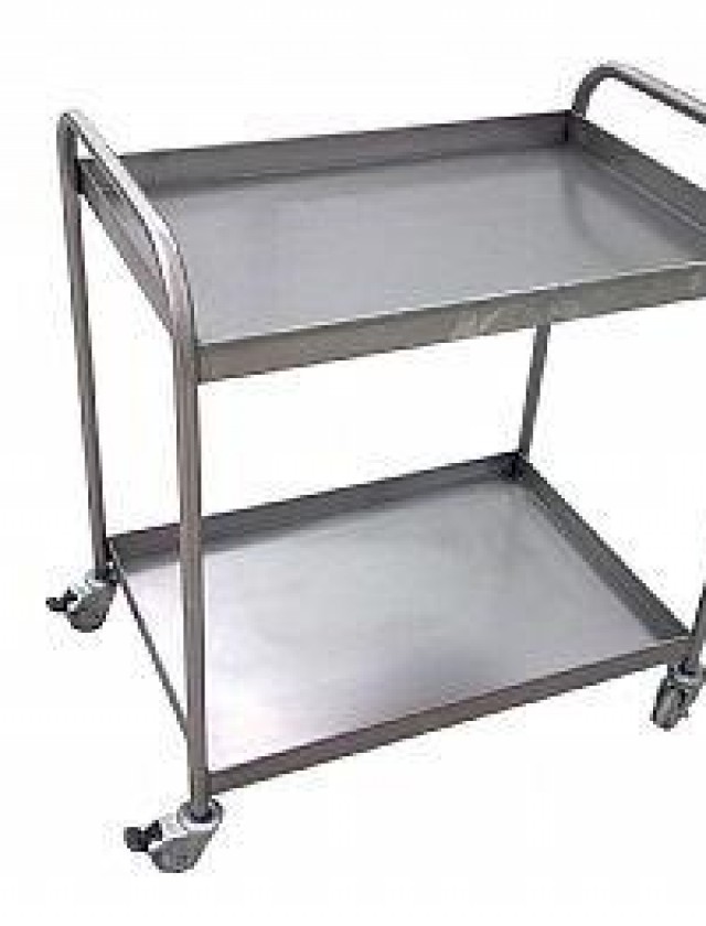 Carro auxiliar com 2 bandejas, rodízios com trava, medindo 0,55x0,80 fabricado totalmente em chapa de aço inox 304. Utilizado para transporte de alimentos.