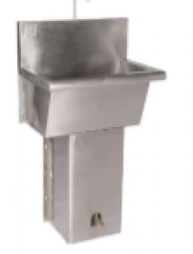 Lavatório de mão ou pia de assepsia fabricado totalmente em aço inox 304, com acionamento mecânico por Pedal, cuba estampada, valvula americana e torneira.