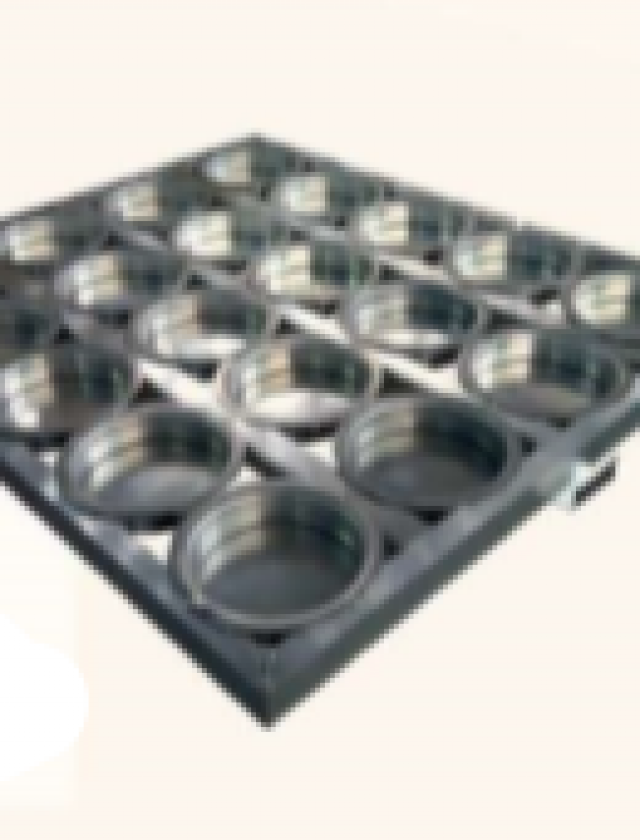 Assadeira fabricada totalmente em alumínio, com cavidades próprias para assar pão de hamburguer de forma padronizada.