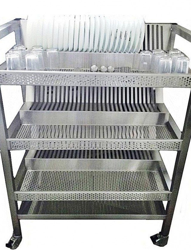 Carro escorredor de pratos, copos e talheres, fabricado totalmente em aço inox 304, medindo 1,08x0,85x1,48, com 3 níveis e com capacidade para 90 pratos. Bandeja retentora de líquidos, dreno e rodízios com trava.
