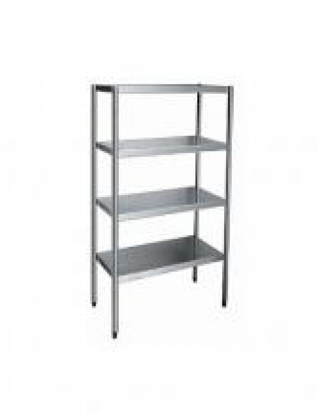 Estante medindo 1,00x0,50x1,75 com 4 planos lisos, fabricada totalmente em aço inox 304 própria para armazenamento de alimentos em câmeras fria e de congelamento.