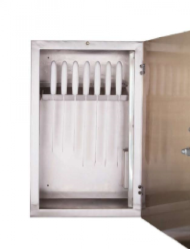 Esterilizador de Facas produzido totalmente em aço inox 304 com capacidade para 8 facas, com chaves e lampada anti bactericida.