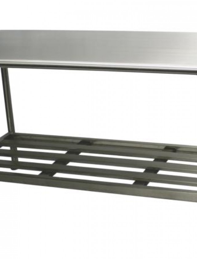 Mesa fabricada totalmente em aço inox 304, com tampo liso, bordas arredondadas, prateleira inferior gradeada e sapatas niveladoras.